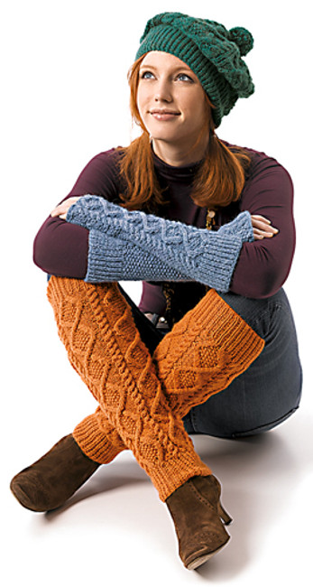 Go cable crazy with legwarmers, gauntlets and a jaunty tam. Make a matched set or choose contrasting shades for quirky, colorful appeal.