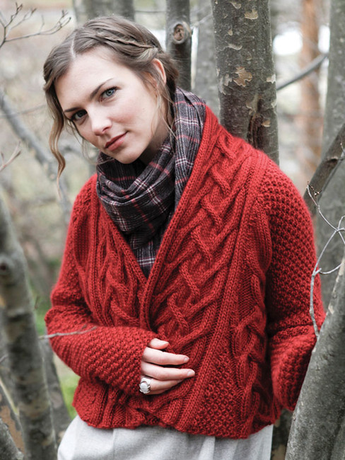 Broad bands of interwoven cabling sweep across the fronts of a cropped raglan sleeved cardigan with unusual triangular fronts.
