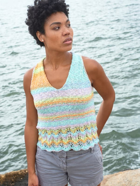Tank is worked in the round from the bottom up to the underarms, then divided for front and back. Pattern includes both written and charted instructions for the stitch pattern at the hem.