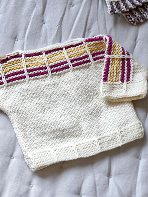 Austin is a simple and cute pullover up the front, casting on for the sleeves, over the shoulder, casting off and on for the neck, then down the back with a slip stitch stripe yoke.