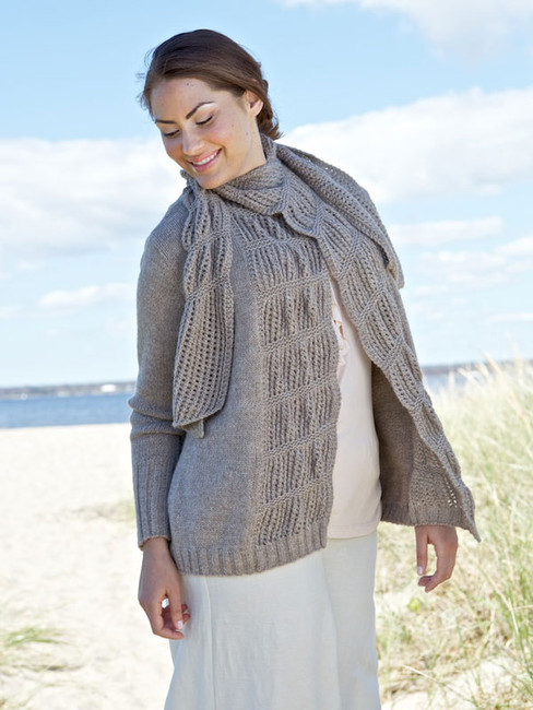 Gracefully ruched panels of lace extend beyond the neckline of a longsleeved stockinette cardigan, creating a cozy scarf.