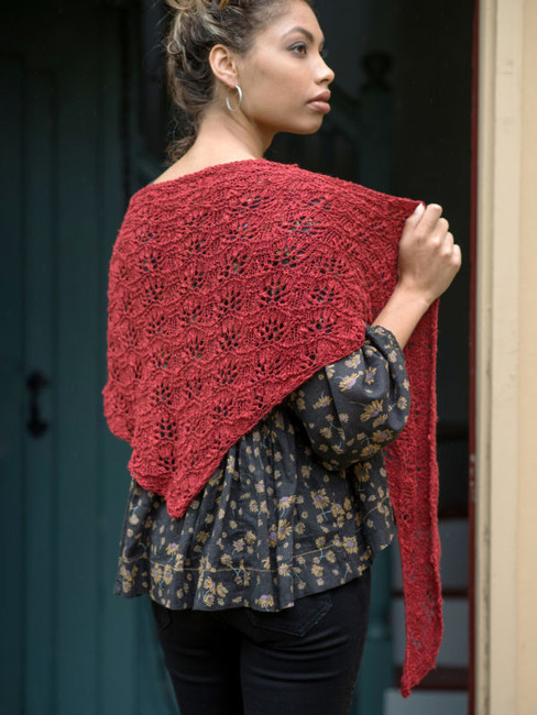 Beginning from the bottom point and working up and out, this triangular shawl knitting pattern mixes lace and textured stitches in Berroco Quinoa.