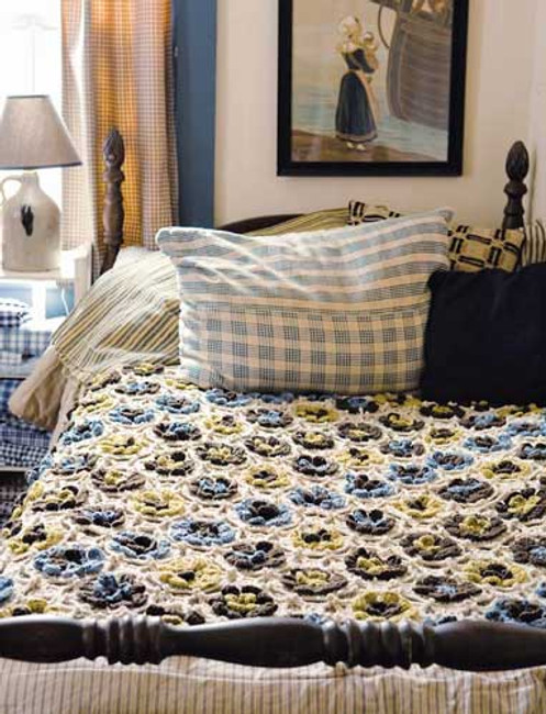 Caylix is a coverlet comprised of multi-colored dimensional flowers joined with a lacy chain of neutral colored yarn.
