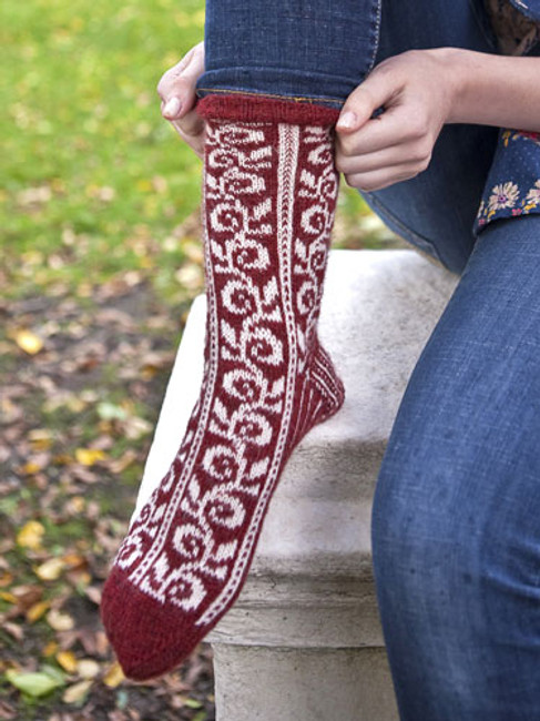 Graceful botanical scrolls adorn this pair of colorwork socks, but the true beauty is the impeccable way the stripes converge on the bottom of the foot!