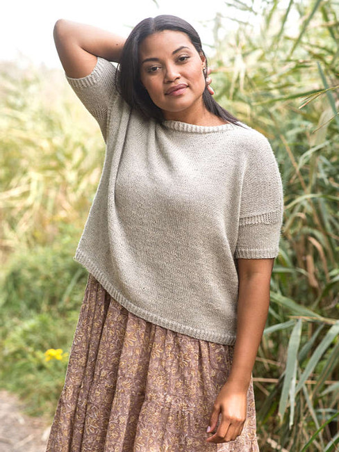 Claudia is a boxy spring tee with simple garter and rib stitch details. Fronts and backs are worked separately and seamed together, while sleeves are picked up and worked down.
