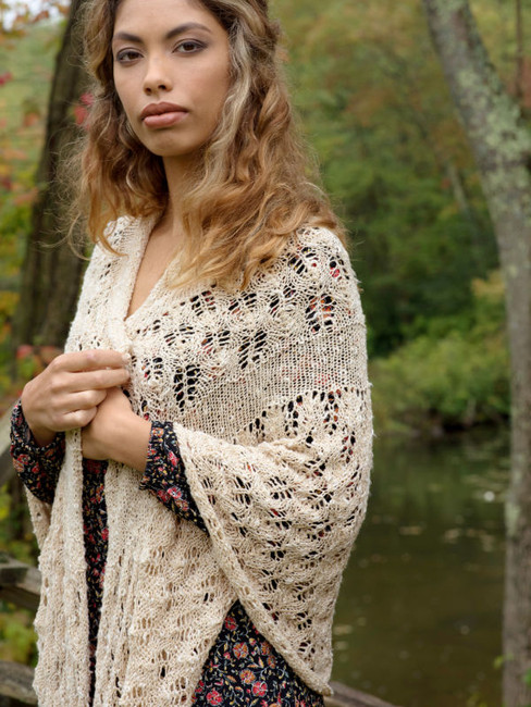 Knit from the center-top down to the wide curving edge, this knitted shawl combines an easy charted lace stitch with stockinette for a sweet summertime wrap. Berroco Quinoa's slub texture adds a chic yet rustic quality.