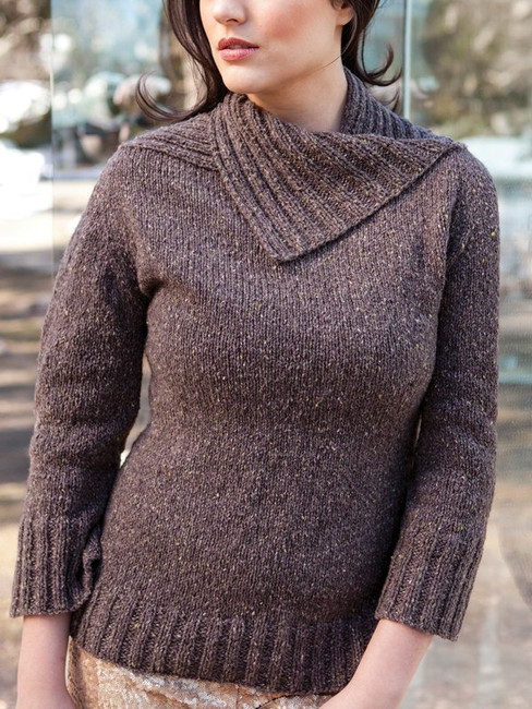 The unusual ribbed neckline of this top-down pullover is echoed by the v-shaped splits on the cuffs of the three-quarter length sleeves.