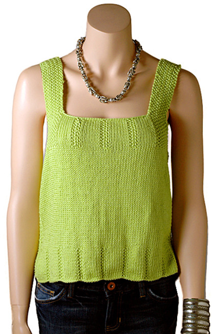 Plane geometry looks right in our cropped tank with engineered seed and stockinette ribs, side seam slits and wide seeded shoulder straps in Touché.