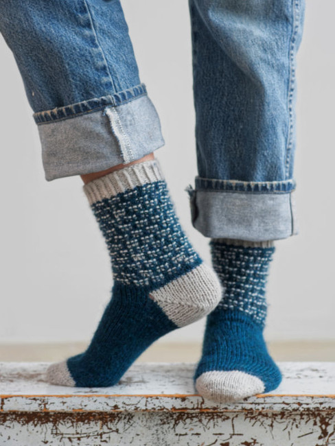 There's really nothing better than a cozy and stylish pair of slipper socks. Using two colors of Vintage DK, these socks are worked from the toe up and feature a clever color work pattern.