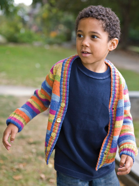 Even the most basic cardigan gets a lift from bright juicy stripes of our hardwearing sock yarn. Check out the sister pattern, Selb.