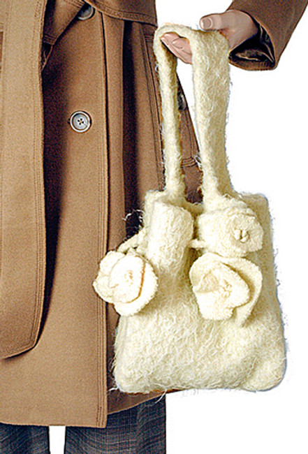 Felting: Wash bag, drawstring and flower fabric for 20 minutes in washing machine set on heavy duty cycle using hot water and soap. Rinse well with cold water. Remove from washer and lay flat, then allow to dry. If pieces have not felted enough, repeat the process. Pieces may be steamed after felting for a more finished look if necessary. Using a pair of scissors with small sharp points, cut eight 1/2” holes evenly spaced around bag 1 1/2” down from top edge with 2 holes on each side. Beg and end at side of bag, weave drawstring in and out through holes.