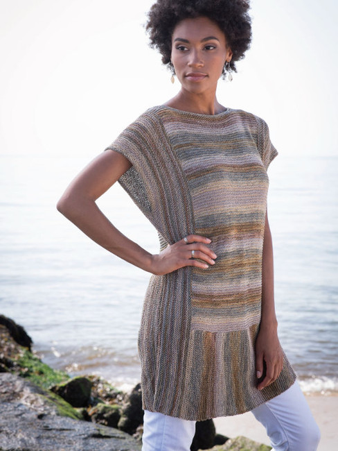 This simple knitted tunic combines garter stitch and the cool variegated colors of Berroco Medina for the perfect spring top. Directional knitting lets the yarn shine while adding stability to the finished tee.