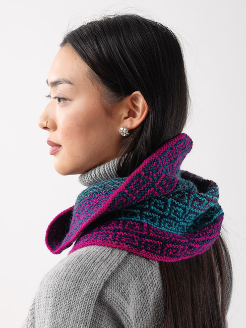Godey features a bold, geometric mosaic knitting pattern with each color tumbling from one section to the next, creating a modern, vibrant feel. Worked in the round for a seamless project, it’s the perfect accessory to add a trendy touch of flair to any outfit while warding off the cold all season long.