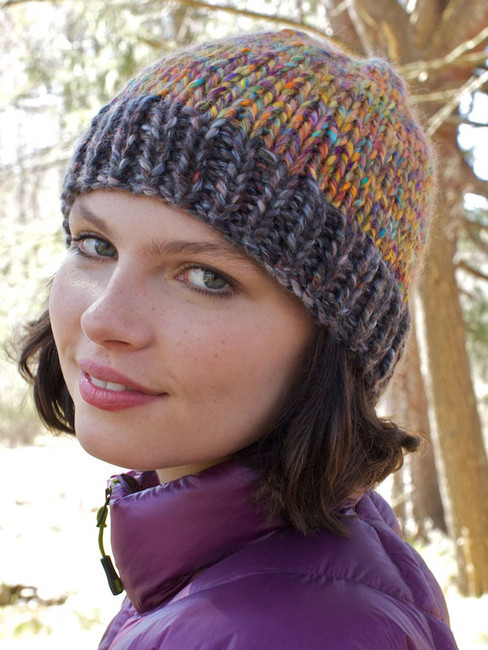 A simple stockinette hat pattern with a contrasting ribbed brim, written for three different weights of beautiful multicolored yarn. Check out two other versions: Joliet in Berroco Borealis® and Joliet in Berroco Boboli.