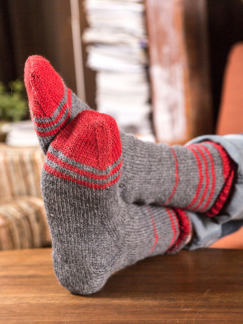 Classic boot socks that work up quickly in a DK weight, Keel features contrast stripes on the toes and cuff.