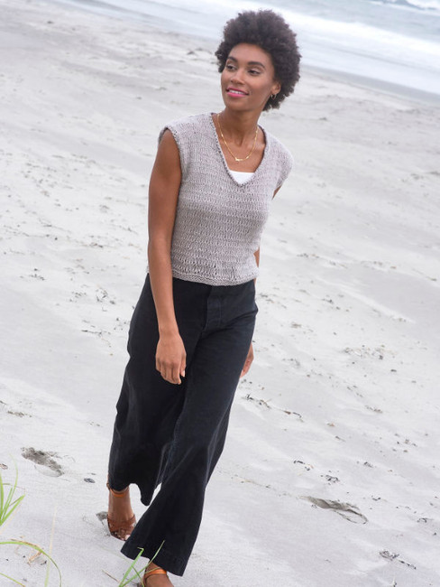 Experiment with simple texture in this easy pullover knitting pattern. Knit nearly seamlessly from the bottom up, this V-neck tee features easy elongated stitches.