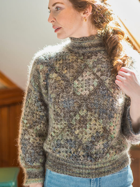 Iconic granny squares are turned on their sides to create a unique and stunning pullover. Finished with knitted ribbing this is sure to be a heirloom pullover.