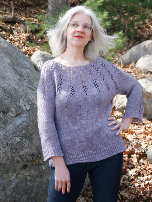 Worked from the top down, this beautiful pullover features a lovely lace yoke and long sleeves. Casual yet sophisticated for everyday Spring wear.
