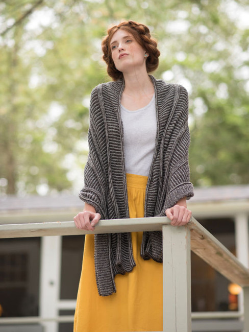 Two colors of Berroco Remix Light are paired together in a slipped-stitch pattern to create horizontal and vertical stripes in a large stole knitting pattern.