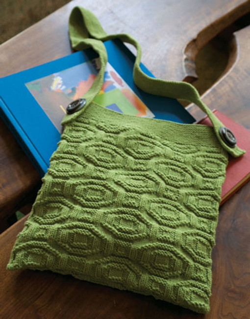 A mid sized shoulder bag with mid century modern octagon and square pattern defined in knits and purls. Variation of Urth and Verdandi.